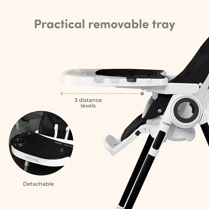 - PREMIUM BABY HIGH CHAIR: ADJUSTABLE AND FOLDABLE - The Sweety Fox portable high chair, which grows with the baby into their toddler years, is very easy to adjust. It offers 5 positions for the reclining seat back, 3 positions for the footrest and 7 different seat heights. Your baby can eat in total comfort in our baby chair. The baby high chair is a convertible high chair designed to be used in many different ways.