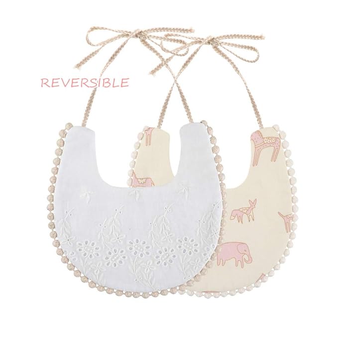 - HANDMADE REVERSIBLE BIB: Our handmade reversible bib comes with a floral fabric on one side,and pure color fabric on the other. It is trimmed with a cotton pom pom lace and has natural cotton string ties.