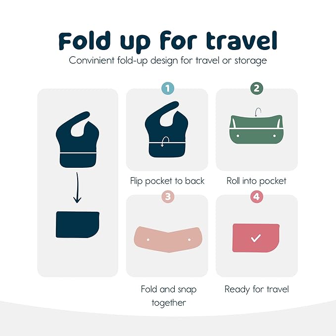 - Mess-Proof Mealtime: Our Easy Bib features a deep catch-all pocket that captures crumbs and spills, keeping clothes and tables clean. The lightweight, water-repellent fabric makes every meal simple and mess-free.