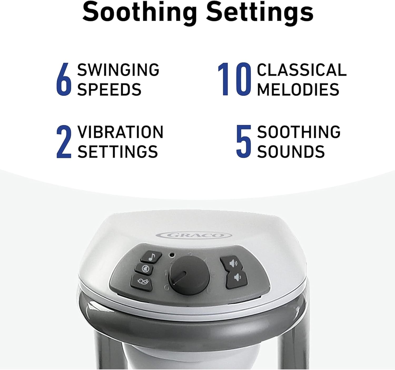- 6 swinging speeds allow you to find the right pace; 2-speed vibration helps to soothe baby; 10 classic melodies and 5 nature sounds to delight and amuse; Mobile with 3 soft toys keeps baby entertained