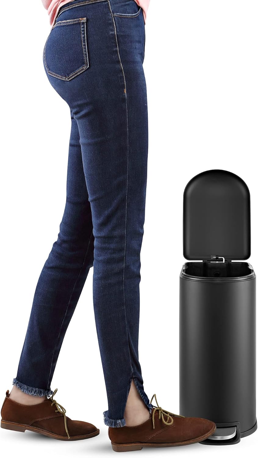 - STYLISH & PRACTICAL DESIGN: happimess Trash Cans clean-lined designs blend beautifully into your existing decor; Dispose of trash hands-free with our convenient step pedal; built-in damper lowers the lid quietly, and closes it tightly to keep odors inside