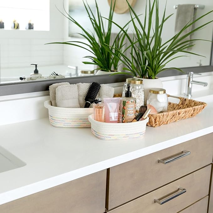 - 5 BASKETS FOR 5X THE ORGANIZING POWER: Life is messy...but your house doesn’t have to be! With 5 beautiful rope baskets for organizing, you’ll defeat messy rooms like a true supermom! Use the largest baskets for Montessori displays or countertop fruits holder, create the cutest dog toy storage or bathroom hand towel holder with the medium ones and stash jewelry or keys in the smallest. Biggest (11.8"x8.7"x4.3"), (11"x7.9"x3.9"), (10.2"x7.1"x3.5"), (9.1"x6.3"x3.1"), Smallest (7.9x5.5"x2.8")