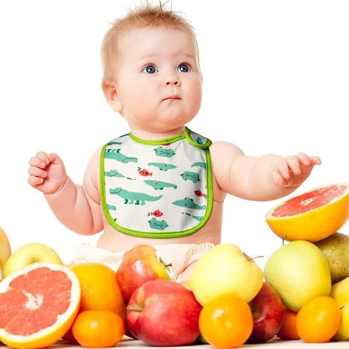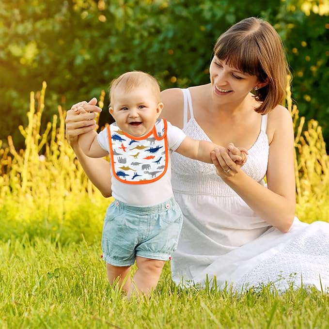 - VALUE SUIT: Adjustable baby bibs comes with 7 different patterns such as crocodile, elephant, lion, bear, dinosaur, coconut tree and turtle. Our waterproof bib can prevent your baby's clothes from being soiled by sauces or soups. With the unisex pattern design and EVA waterproof material, you needn't pay more for extra boy or girl style bibs frequently. Saving parent’s time, effort and money.