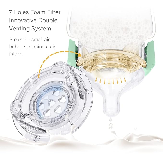 - 👶INNOVATIVE ANTI COLIC VENTING SYSTEM - Smart 360° anti-colic system. The innovative 7 holes foam filter can break the small air bubbles when milk flows through to eliminate air intake and discomfort for babies.