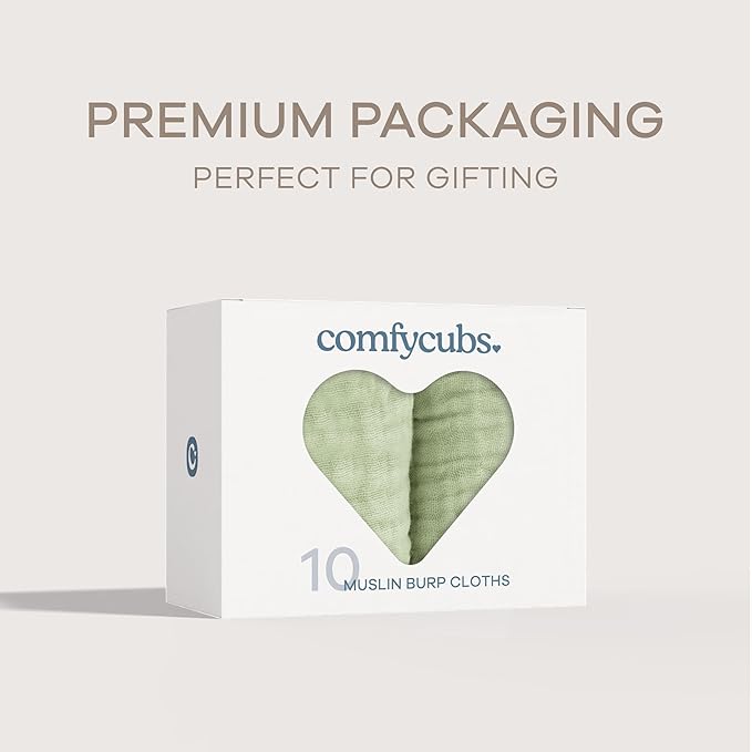 Comfy Cubs Muslin Burp Cloths 20" x 10", Pack of 10 - Large, 6-Layer, Ultra Absorbent 100% Cotton for Baby Drool and Messes - Soft, Safe & Gentle Baby Burp Cloths for Boys & Girls - Sage