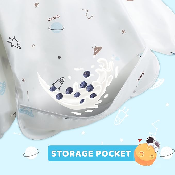 - STORAGE POCKET- A pocket large enough to hold art supplies or catch drips and spills, Keeping your babyโs clothes and floor clean after meal time. Fewer outfit changes for mom! Besides, the bibs can fold up perfectly into a pocket-sized bag which is originally built for easy transport. Always ensure fabric is completely dry before storing