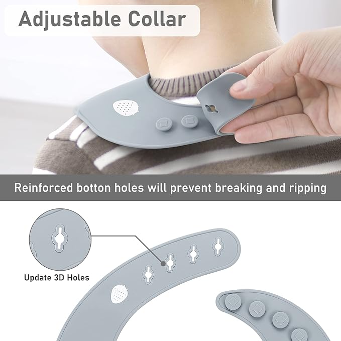 - 4 ADJUSTABLE SIZE & EASY TO USE: Four neck size to facilitate the use of different age groups of infants and young children. Tie around the neck to prevent from pulling off easily and stay securely on toddlers. The silicone baby bibs with snaps to be as easy to use as possible;Just use the snap buttons to adjust and fit the bibs soft collar around your little one's neck