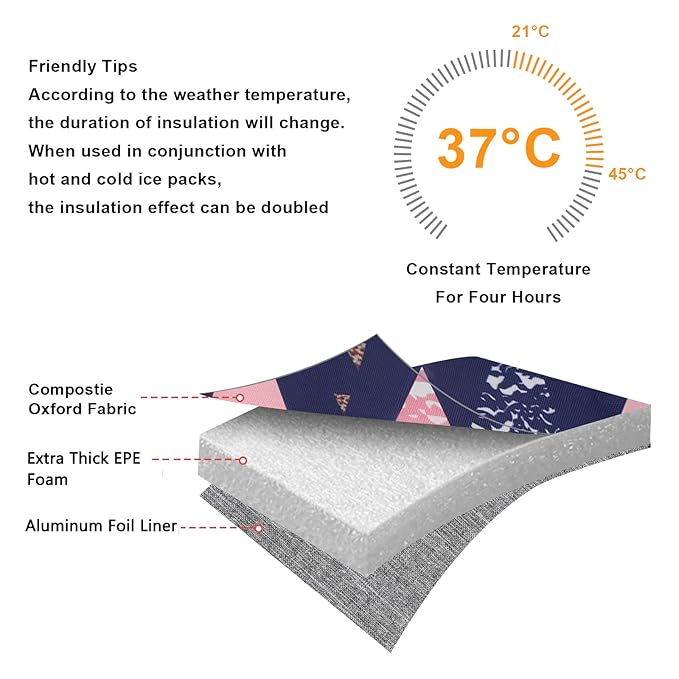 - HIGH QUALITY MATERIALS: Made of high quality water-resistant composite oxford fabric, 8mm extra-thick EPE foam and food-grade aluminum foil liner. No odor, non-toxic, food safe, durable, lightweight. Effectively keep bottles stay cold, warm or fresh for hours, it keeps breast milk fresh.