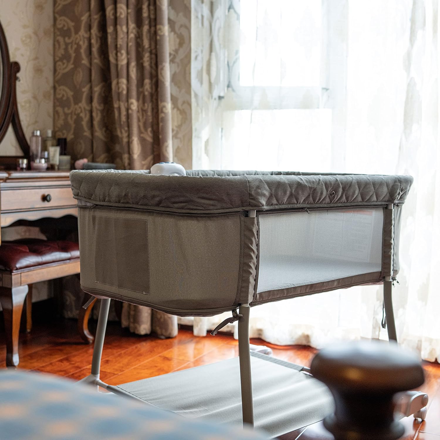 - Portable and Adjustable: 4 universal wheels with brakes are flexible. You can transfer the Bassinet to Playard easily by adjusting two zippers and four straps on the bed cover. Change the wheelsâ position, you will get additional Rocker Mode