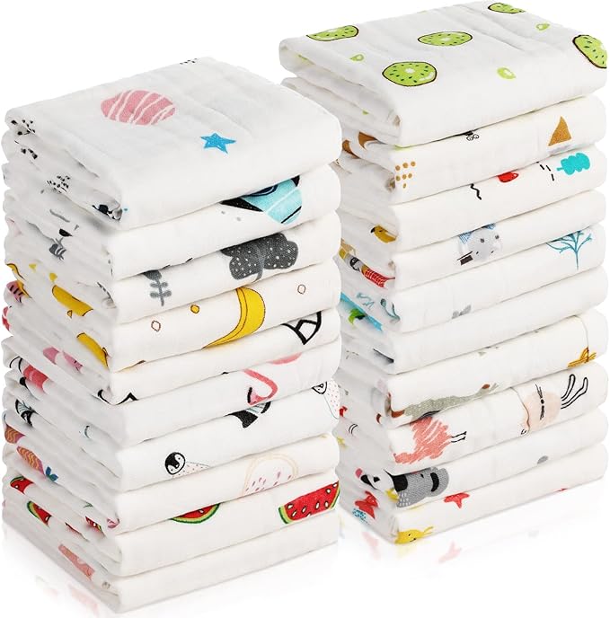 - Proper Size and Cute Design: 20 pack baby washcloths for each set, extra large size 10 x 20 inches, ideal for absorbing the mess slurped u; 20 cute designs include fruits, animals and so on, ideal for boys and girls; When your baby is drooling or spit up, you can use the muslin burp cloths to wipe your baby's mouth, the breathable fabric is healthy for babies
