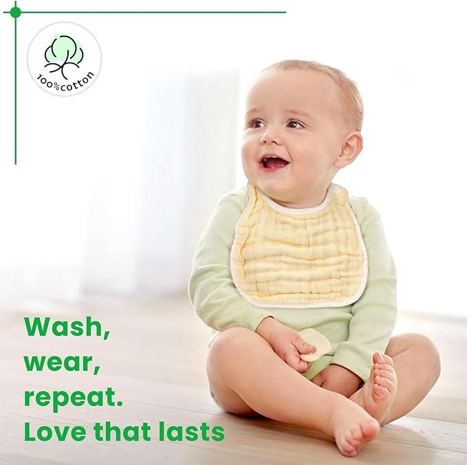 - 1.100% Soft Organic Muslin Cotton: Baby's delicate skin needs soft and comfortable fabrics to take care of. Organic Muslin cotton, one of the world's softest fabrics, is a very suitable choice. This baby bib is made of 100% organic Muslin cotton, which is soft and comfortable to the touch and absorbent and breathable. Each one is made of 8 layers of 100% organic Muslin cotton gauze, which keeps baby's skin and clothes fresh and dry at all times.