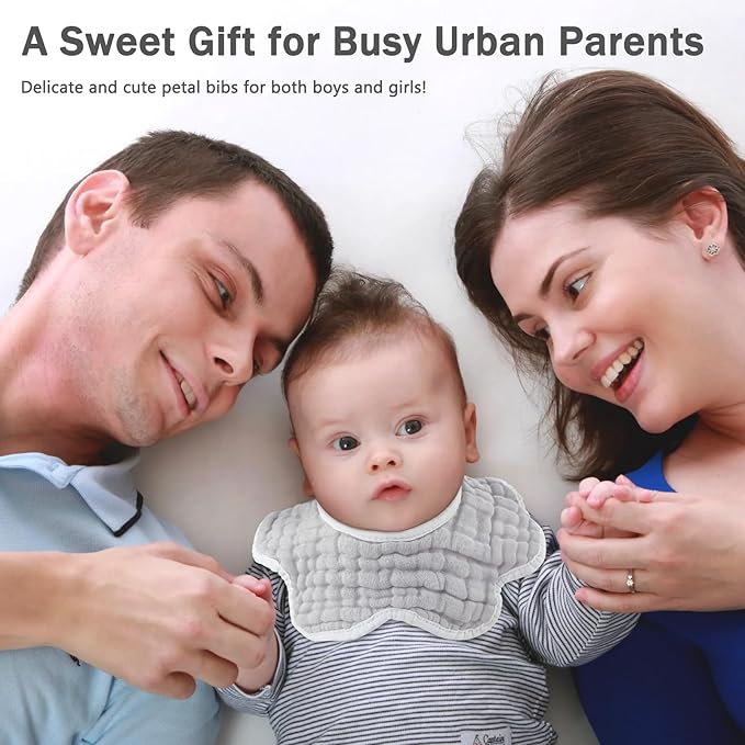 - 100% Soft Organic Muslin Cotton:Babies' tender skin needs to be pampered with soft, breathable Muslin cotton. This petal-shaped bib is made of 100% natural Muslin cotton, which is very soft and comfortable, absorbent and breathable. Each bib is made of 8 layers of Muslin cotton gauze to ensure that your baby stays dry, comfortable and clean at all times.