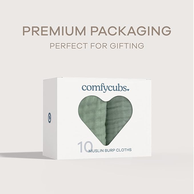 Comfy Cubs Muslin Burp Cloths 20" x 10", Pack of 10 - Large, 6-Layer, Ultra Absorbent 100% Cotton for Baby Drool and Messes - Soft, Safe & Gentle Baby Burp Cloths for Boys & Girls - Fern