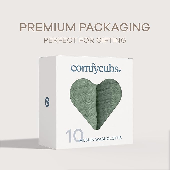 Comfy Cubs Muslin Baby Washcloths 10 Pack - Soft 6-Layer Cotton Wash Cloths for Sensitive Skin - 10"x10" Large, Gentle, Absorbent Infant Essentials for Newborn and Toddlers - Fern
