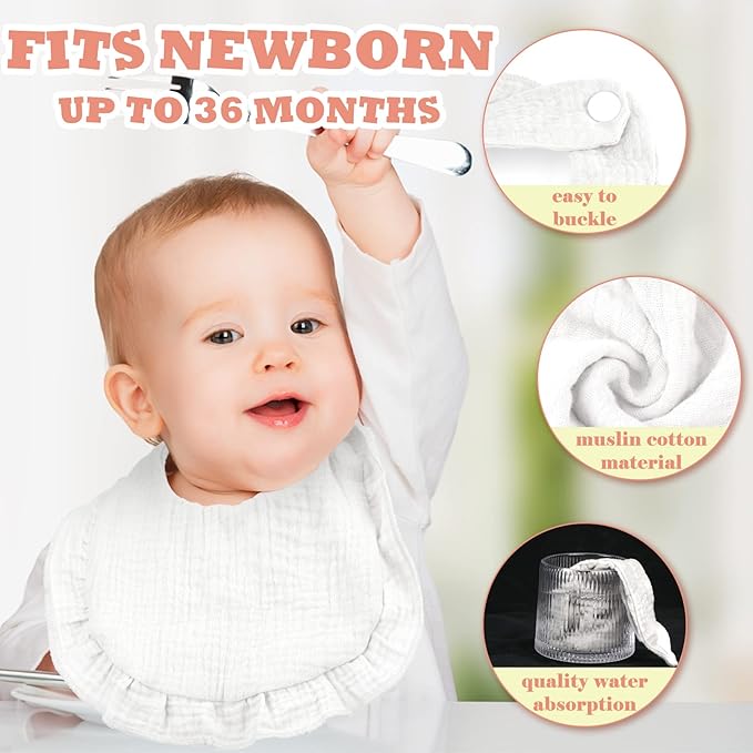 Seematn 10 Pcs Baby Muslin Bibs Drool Bibs Bandana Ruffle Soft Cotton for Newborn Baby Infants Girl Teething Toddlers Boy(White)