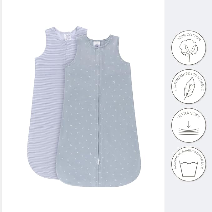 - Adorable & Practical Duo: This charming 2-pack includes a whimsical dusty blue leaf print and a playful stripe pattern sleep bag. Available in boy, girl and gender-neutral unisex designs, it comes in four sizes to suit babies stage from newborn up to 18 months. Perfect for growing little ones it adds a touch of warmth and style to their sleep routine.