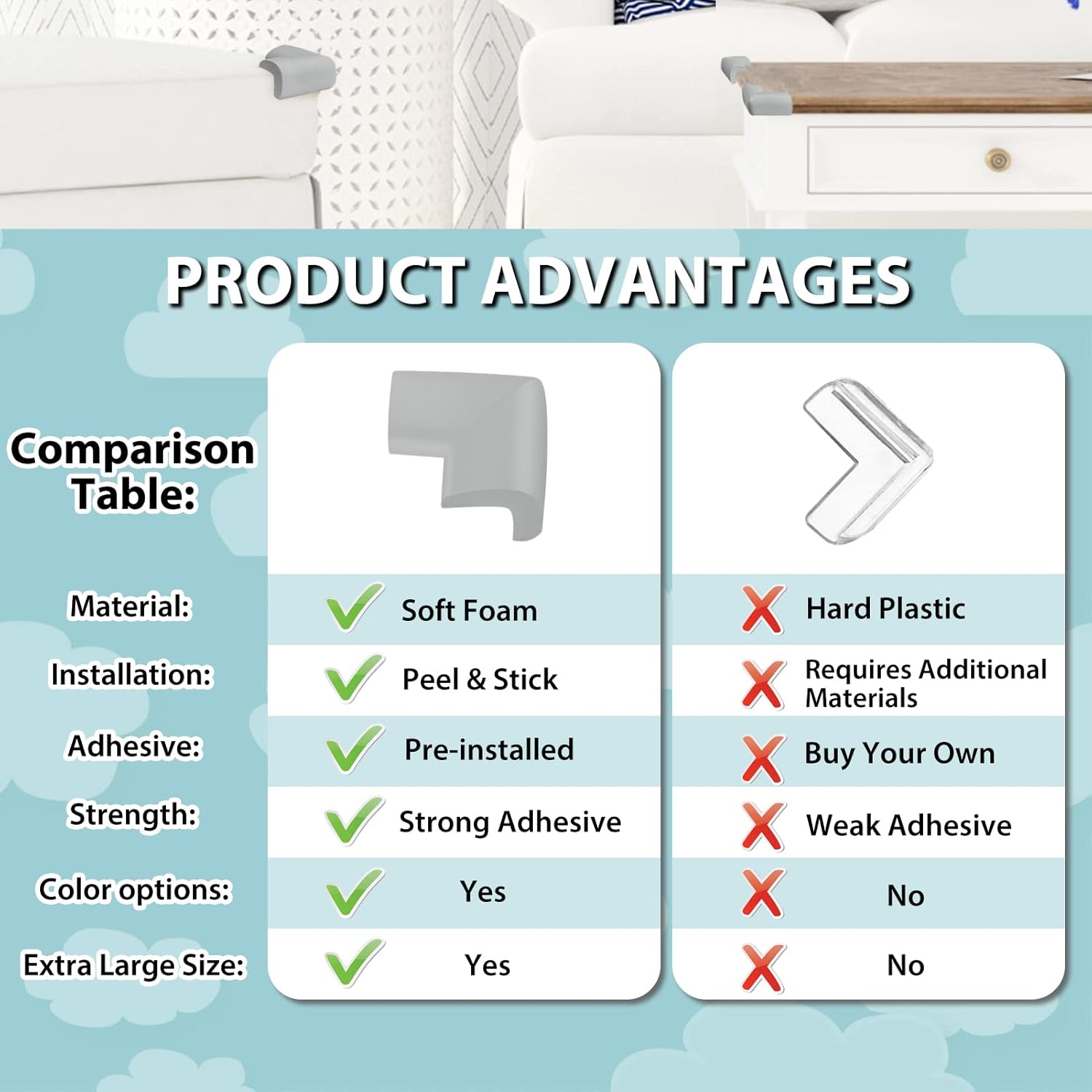 - Wide Application:Corner guards can be used for sharp edges of tables, chairs, furniture and fireplaces, and any hard corner that may cause accidental injuries to our children. Give babies a bigger space to play.