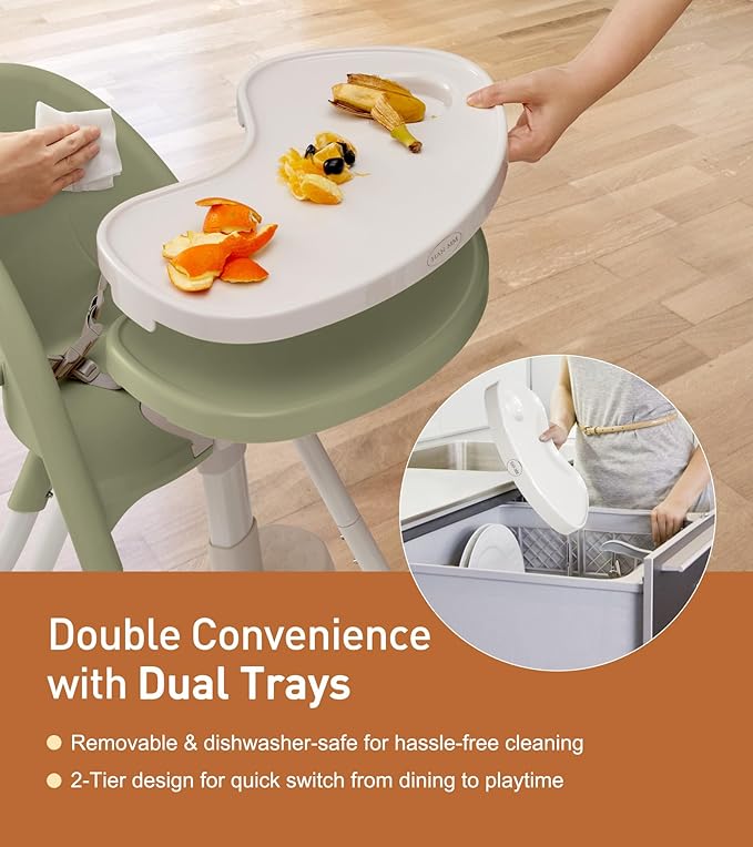 - Wipeable & Dishwasher Safe: This high chairs for babies and toddlers features double trays that are dishwasher safe and include a built-in cup holder to help contain spills. The smooth, BPA-free surfaces and wipeable materials make everyday cleanup fast and stress-free.