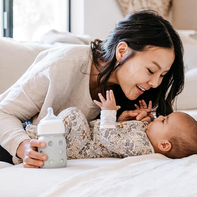 Lifefactory 8-Ounce Wide Neck Glass Baby Bottle with Protective Silicone Sleeve and Stage 2 Nipple, Stone Grey (LG2211WCG4)