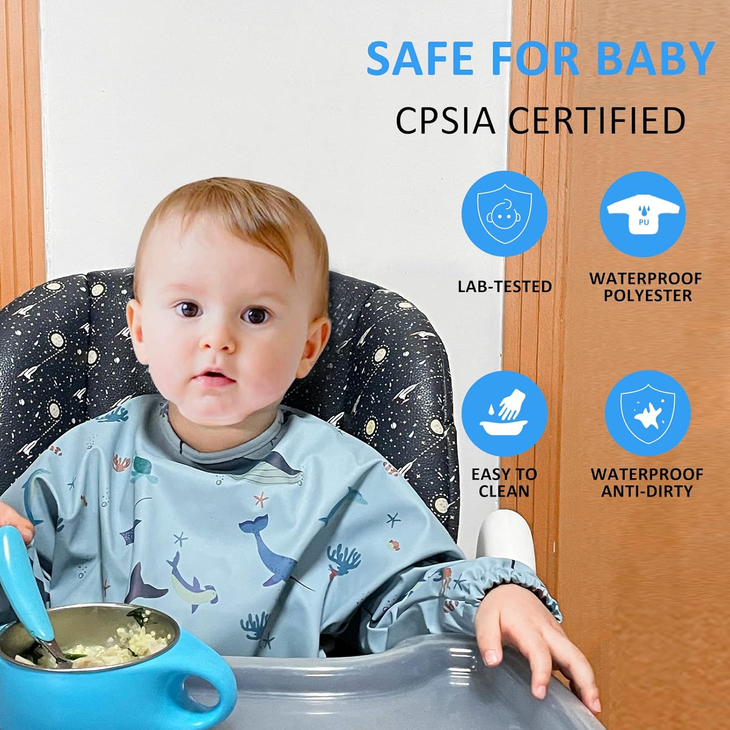 - Keeping Baby Clean & Saving Cleaning Up Time: The baby bib with sleeves for eating is full coverage & long sleeve design. Our baby eating bib not only keeps baby clean but keeps the highchair clean as well! This toddler smock bib is waterproof, stain-resistant, oil-resistant. Don't get worried about the mess, it's just easy to get all the food and stains form it. Our waterproof baby bibs saves you so much clean up time. Making meals and hands on activities less of a hassle