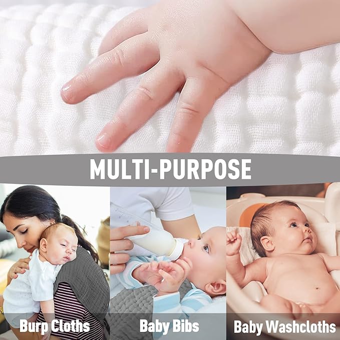- WIDE APPLICATIONS: The baby muslin cloths can be applied as burp rags, baby bibs, baby washcloths and towels, baby wipes or cloth diapers, a must-have for burping, teething or spitting up!