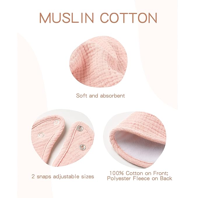 - Soft and Absorbent: The front of baby bibs are made of 100% cotton(Muslin) and the back are polyester(comfort fleece) for maximum absorption with skin-friendly soft touch. The bib soaks up all drools and spits to keep you and your baby clean and dry, no more wet clothes
