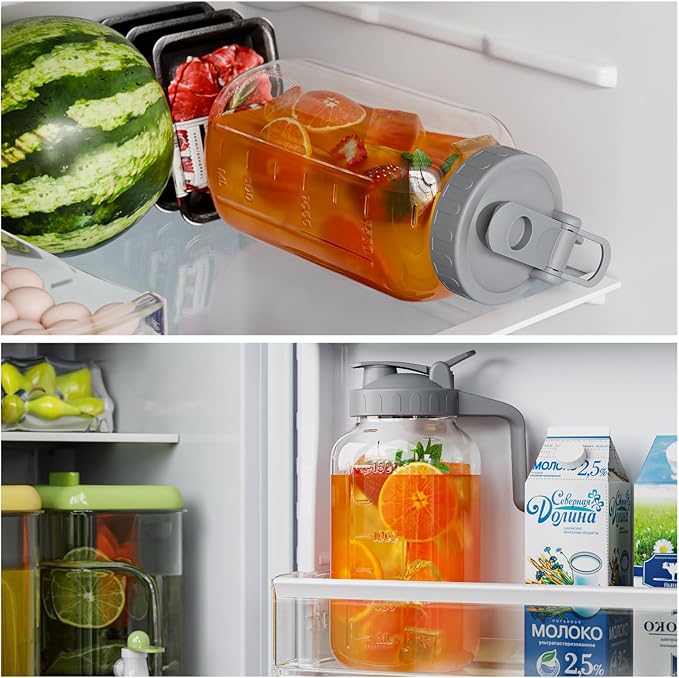 - 【Spout Sealed Lid with Handle】 - The 64oz big jug with silicone seal in the pour spout lid, Leak proof and better maintain the freshness and taste of the beverage, avoid mixing the smell of other foods in the fridge. The flip-top lid is easy to pour and the jug is securely fastened to the lid