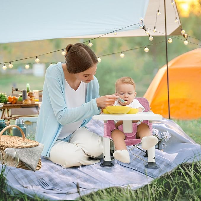 Baby Travel Booster Seat with Double Tray, BabyBond Upgraded Toddler Portable Baby Chair, Booster Seat for Dining Table, Stable and Foldable Booster Baby Chair for Indoor/Outdoor (Pink)