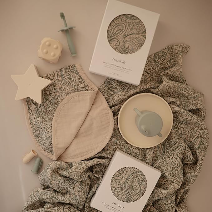 mushie Muslin Baby Burp Cloths | 100% Organic Cotton, Set of 2 (Green Paisley/Fog)