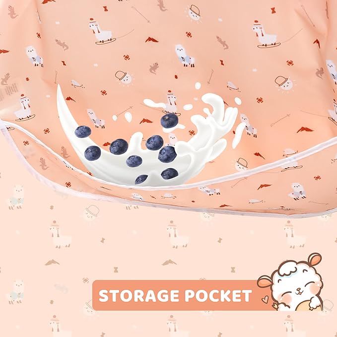 - STORAGE POCKET- A pocket large enough to hold art supplies or catch drips and spills, Keeping your babyโs clothes and floor clean after meal time. Fewer outfit changes for mom! Besides, the bibs can fold up perfectly into a pocket-sized bag which is originally built for easy transport. Always ensure fabric is completely dry before storing