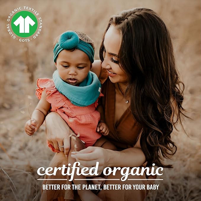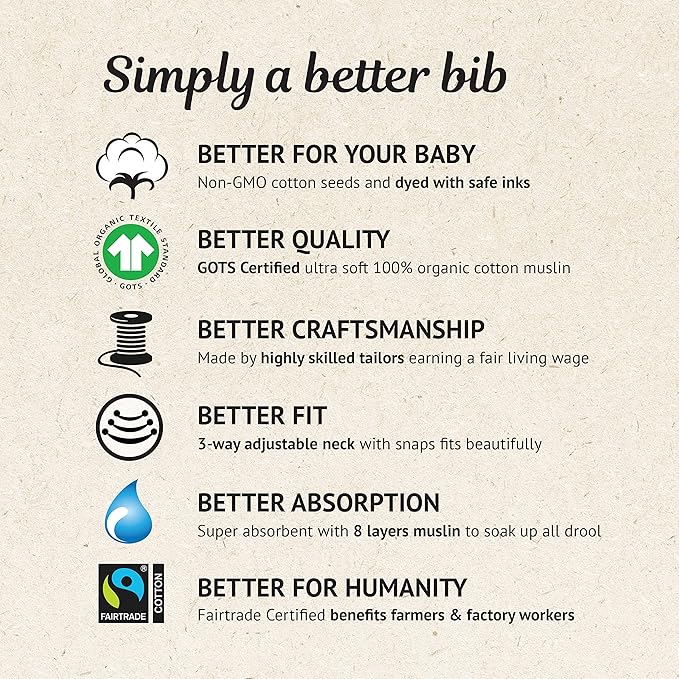 - LUXURIOUSLY SOFT – Crafted from 100% organic cotton muslin, this bib is breathable, durable, and super absorbent. Adjustable nickel-free snaps ensure a secure fit on babies and toddlers without the oversized look of traditional feeding bibs