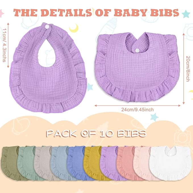 Seematn 10 Pcs Baby Muslin Bibs Drool Bibs Bandana Ruffle Soft Cotton for Newborn Baby Infants Girl Teething Toddlers Boy(Light Colors)