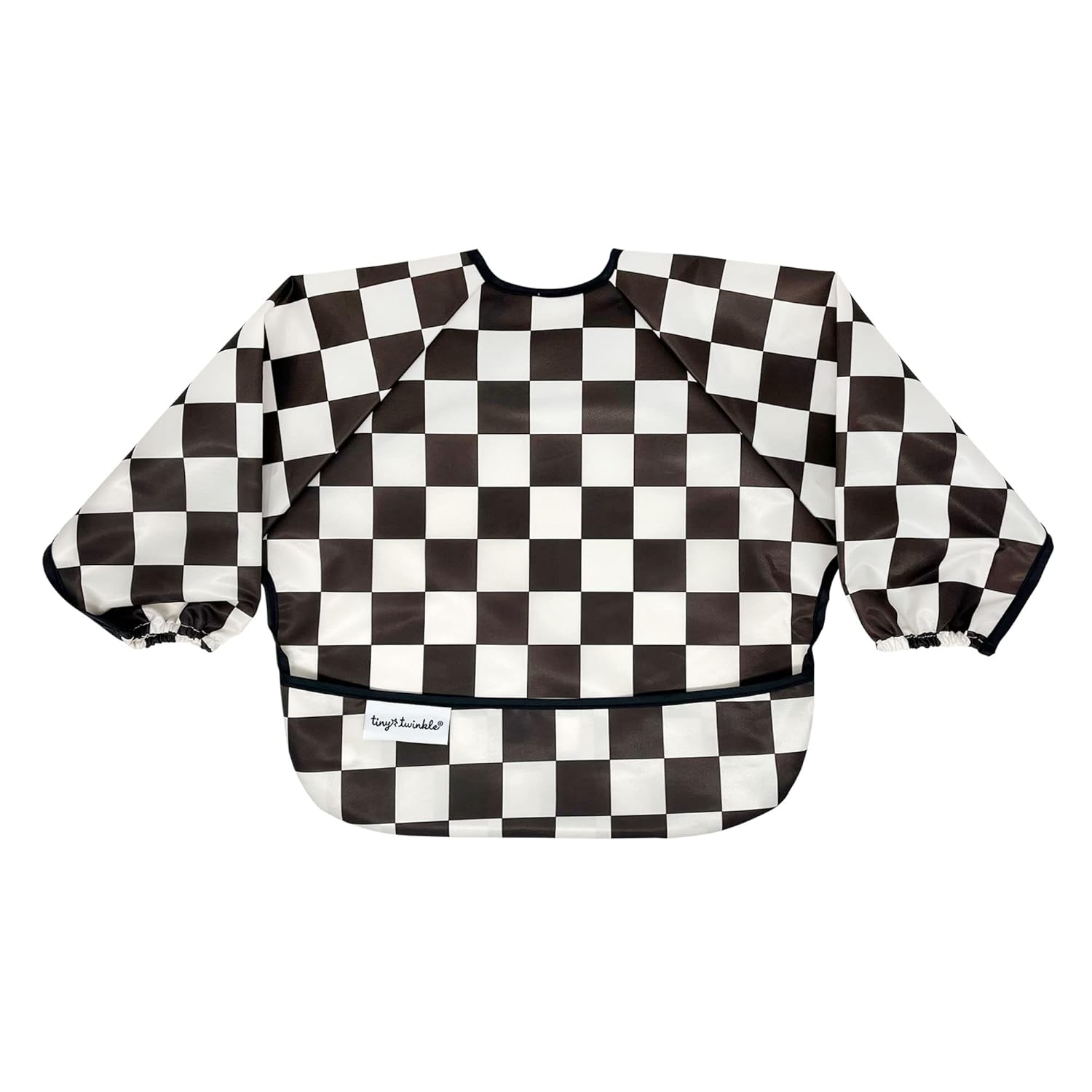 Tiny Twinkle Mess Proof Baby Bib,Waterproof Smock Baby Bib for Eating,Machine Washable Long Sleeve Bib,Baby Led Weaning,Toddler Bib,BLW Supplies(Checkers Black, Small 6-24 Months)