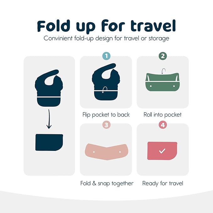 - Mess-Proof Mealtime: Our Easy Bib features a deep catch-all pocket that captures crumbs and spills, keeping clothes and tables clean. The lightweight, water-repellent fabric makes every meal simple and mess-free.