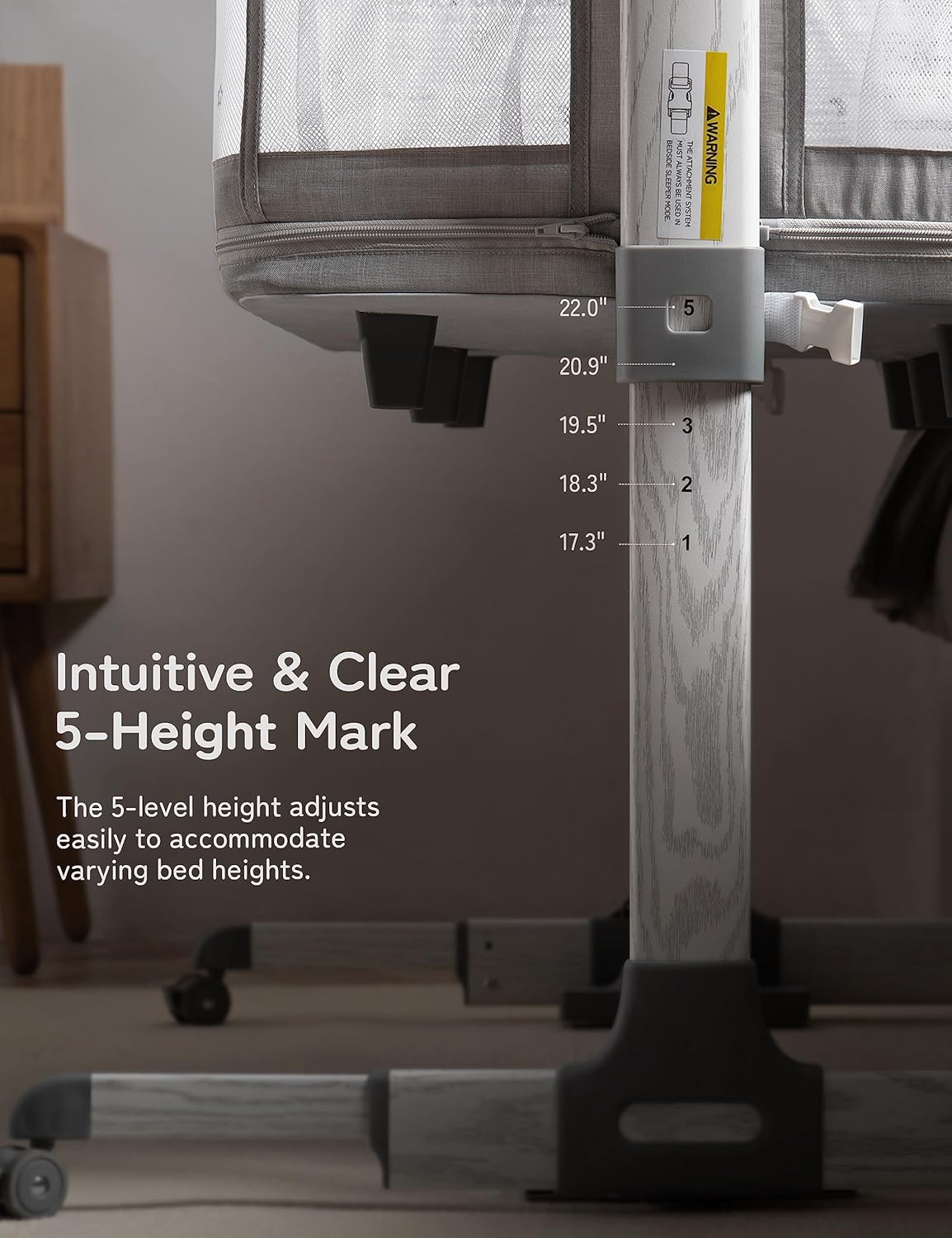 - Height Adjustable: besrey bassinet for baby has 5-level adjustable height, it’s suitable for varying parents' beds, including box beds