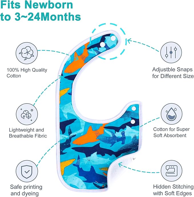 - 【3 SIZE ADJUSTABLE SNAP BUTTONS】Each baby bib has 2 sets of adjustable snaps to adjust the bib according to the size of the baby's neckline. Instead of Velcro, the baby bibs are fixed with snaps, so they are firm and not easy for babies to take off. The snaps are designed on the side of the bib instead of the back, making it easy to open and remove the bib from the side when the baby is asleep without waking the baby
