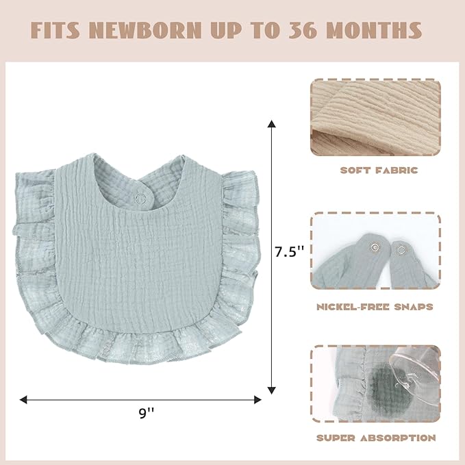 - Unique design: The muslin baby girl bibs use an elegant flounce design, practical and beautiful. And the neutral color can match well with clothes, suitable for girls and boys. The 8-pack color set can be a meaningful baby shower gift for new moms and dads!
