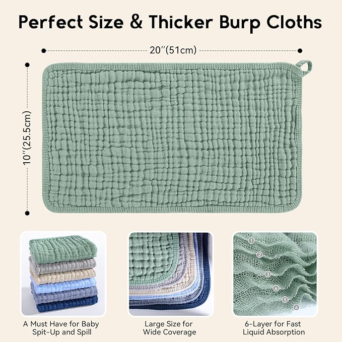 - Excellent Absorbent: Featuring 6 layers of absorbent muslin and fluffy structure design, our burping cloths for babies provide maximum absorption with tendor touch, works well to protect your teething baby from all dribble and spit ups soaking their clothes. Large 20''X10'' size provides maximum coverage and extra layering adds durability, making them ideal for use in any season.