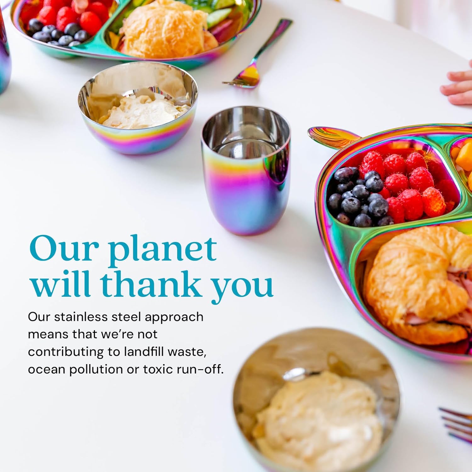 - Kid Approved β Ahimsa Mindful Mealtime Sets make mealtime fun with vibrant and colorful stainless steel kids plates that children adore. Included is a stainless steel toddler plate with dividers, a 8 oz. kids stainless steel cup and small baby bowl, and kids silverware (1 kid fork, 1 kid spoon).
