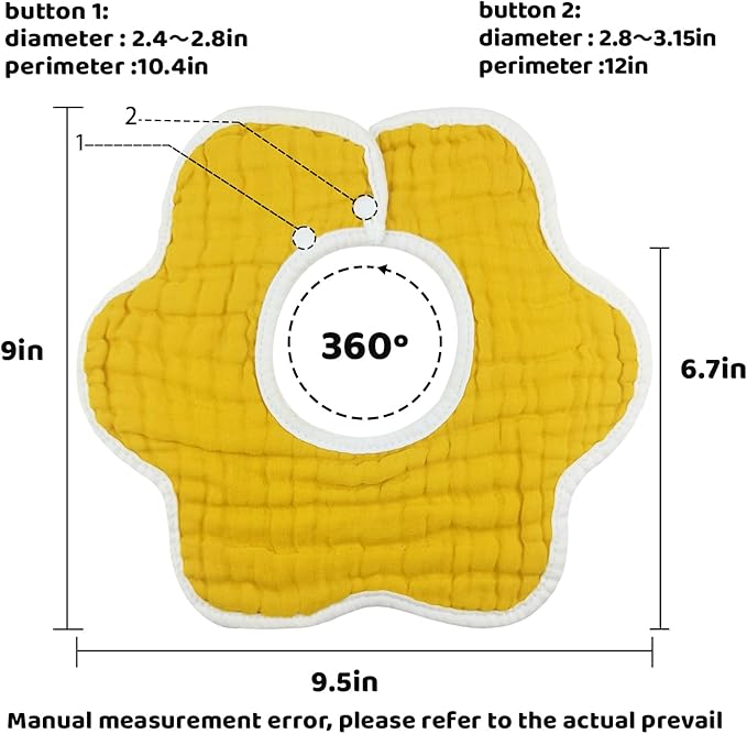 - 4.Unparalleled Quality and Craftsmanship: Our commitment to excellence is reflected in the superior quality of our baby bibs. Each bib is meticulously crafted with attention to detail, ensuring durability and long-lasting performance. From the premium 8-layer Muslin cotton material to the secure adjustable buttons, our bibs are designed to exceed your expectations.