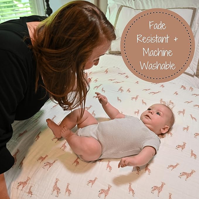 - CUTE GIRAFFE PRINT - Adorable giraffes with their long necks and sweet expressions bring a playful and gentle vibe to your baby’s world. Symbolizing curiosity and adventure, it’s perfect for cozy naps and adding a touch of whimsy to your little one’s day
