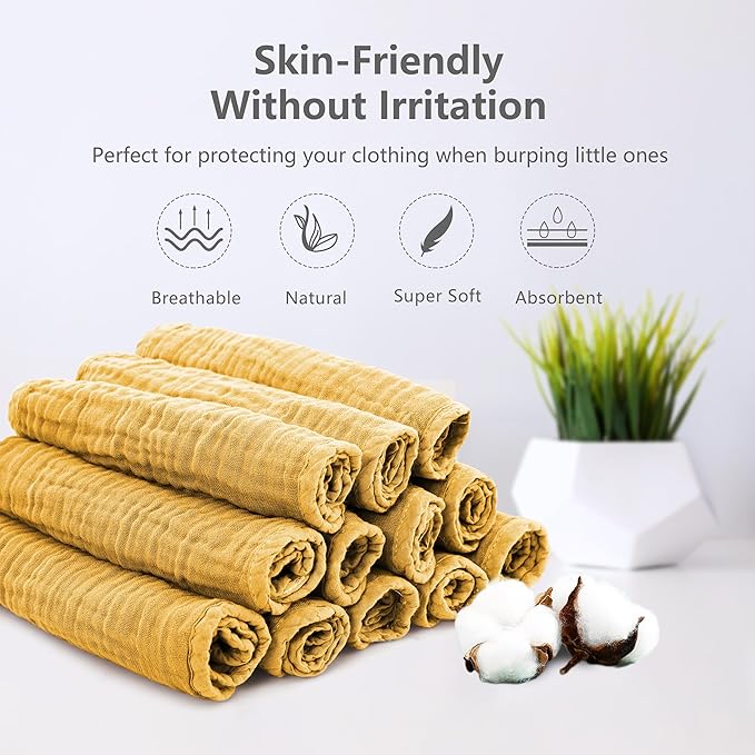SWEET DOLPHIN 12 Pack Muslin Burp Cloths Large 100% Cotton Hand Washcloths for Baby - Baby Essentials Extra Absorbent and Soft Boys & Girls Milk Spit Up Rags for Newborn Registry - Honey, 20" X10"