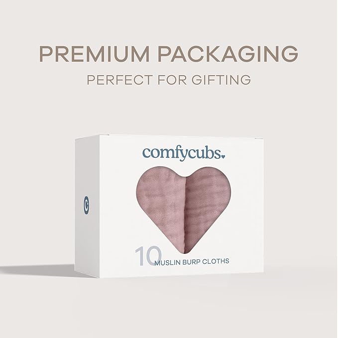 Comfy Cubs Muslin Burp Cloths 20" x 10", Pack of 10 - Large, 6-Layer, Ultra Absorbent 100% Cotton for Baby Drool and Messes - Soft, Safe & Gentle Baby Burp Cloths for Boys & Girls - Mauve