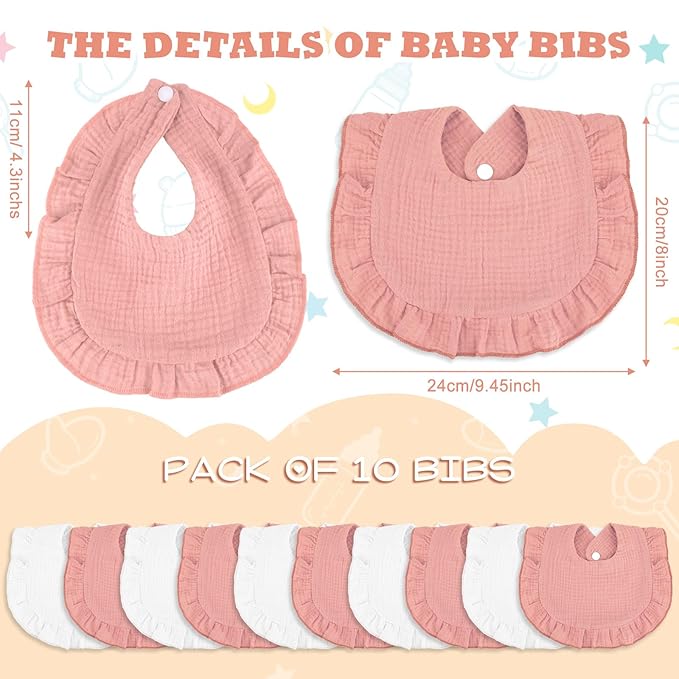 Seematn 10 Pcs Baby Muslin Bibs Drool Bibs Bandana Ruffle Soft Cotton for Newborn Baby Infants Girl Teething Toddlers Boy(Pink, White)