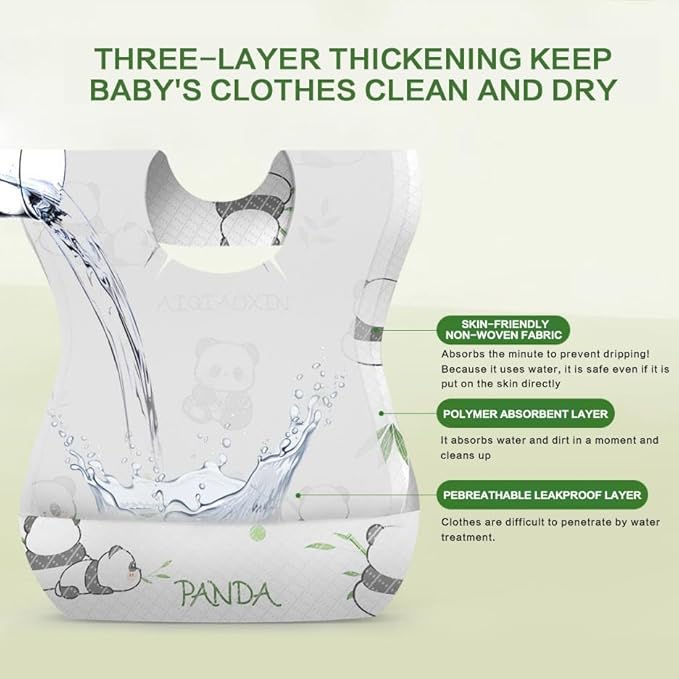 • 【Skin Friendly&Non-Woven Fabric】Our disposable bibs are composed of multi-layer environmental friendly fabrics. The first layer is mask level skin friendly non-woven fabric, the middle is a polymer absorbent layer, and the back is a PE breathable and leak proof lining. Keep your baby's clothes clean and dry.
