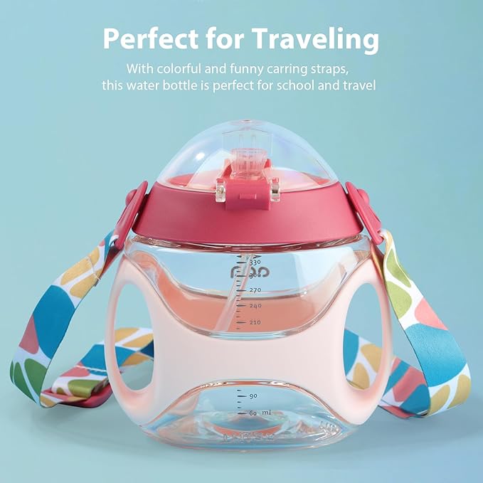 Baby Straw Water Bottle with Handles and Strap, Portable Travel Toddler Cup for School,11 Ounce(Pink)