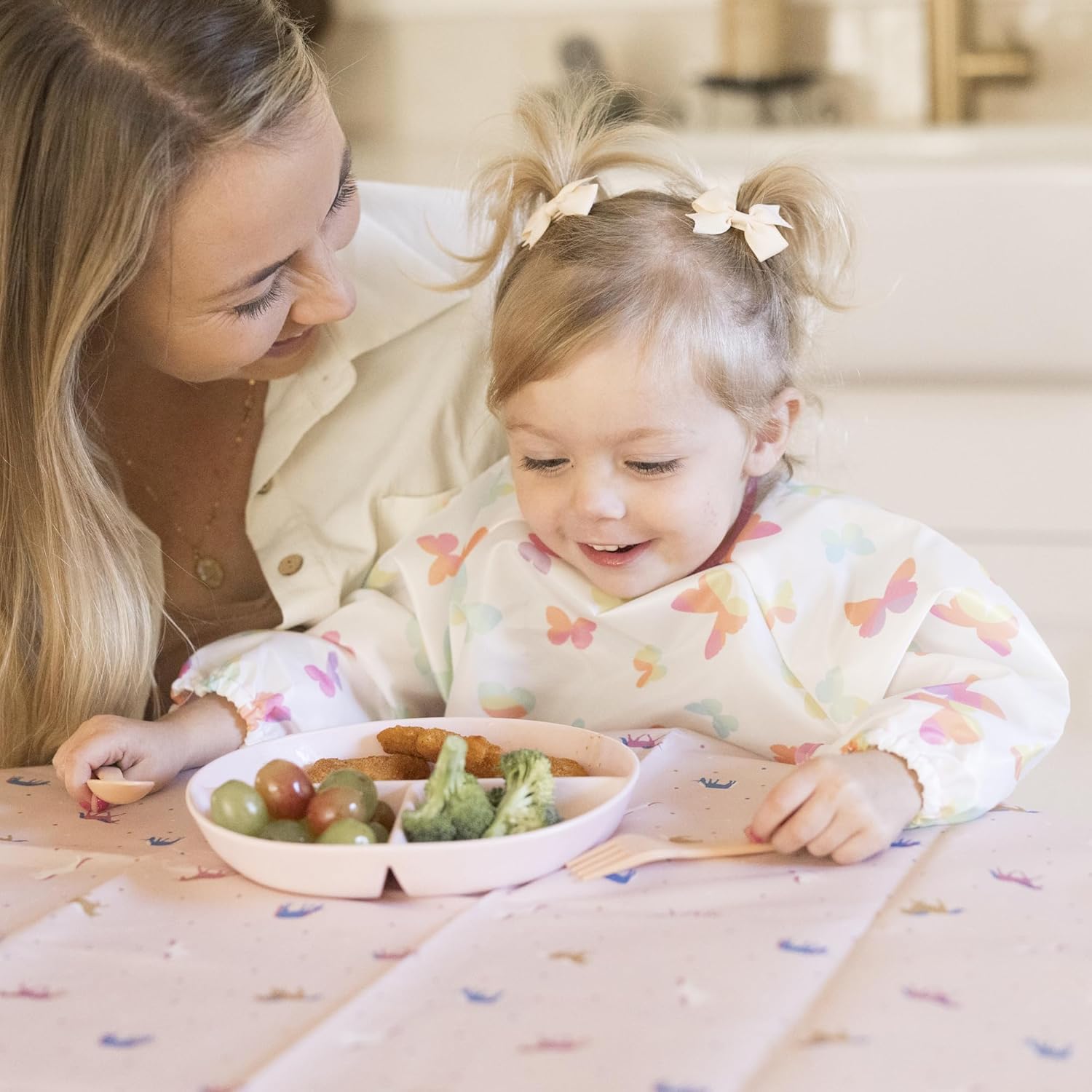 - TRAVEL BUDDY:The must-have baby feeding essentials for on-the-go parents! Our long sleeve waterproof smock bib (fits 6-24 months) is a versatile wipeable bibs with scratch-free closures and 360 degrees puree-proof protection.This bib with sleeves is perfect for plane or car meals, It folds flat in diaper bags,handles baby-led weaning messes and makes a great gender-neutral baby shower gift.Ideal for parents needing baby eating essentials on the go.