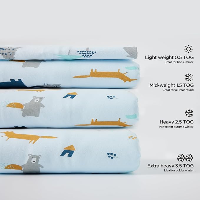 - 2.5 TOG WINTER SLEEP SACK - Our 2.5 tog sleep sack is filled with medium thick polyester fiber that provides enough warmth for cooler nights without causing overheating in warmer weather. A balance between insulation and breathability is key to ensuring baby's comfort throughout the year. Outer and inner lining are 100% premium cotton that is gentle on your baby's delicate skin.
