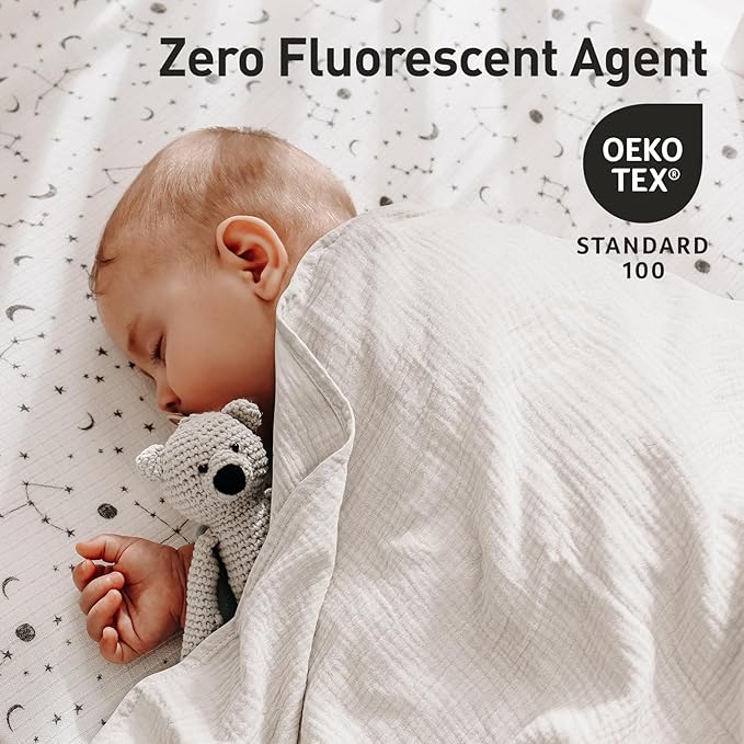 - SUITABLE SIZE: All of our products have passed the OEKO-TEX STANDARD 100 certification.Our muslin baby blanket measures 38'' x 40''(95 x 100 cm; material is approximately ยฑ 1 inch), which is large enough to easily wrap or swaddle babies from startling themselves awake with random arm movements, recreates the secure and cozy feeling of the womb, helping soothe your baby and enabling them to sleep better