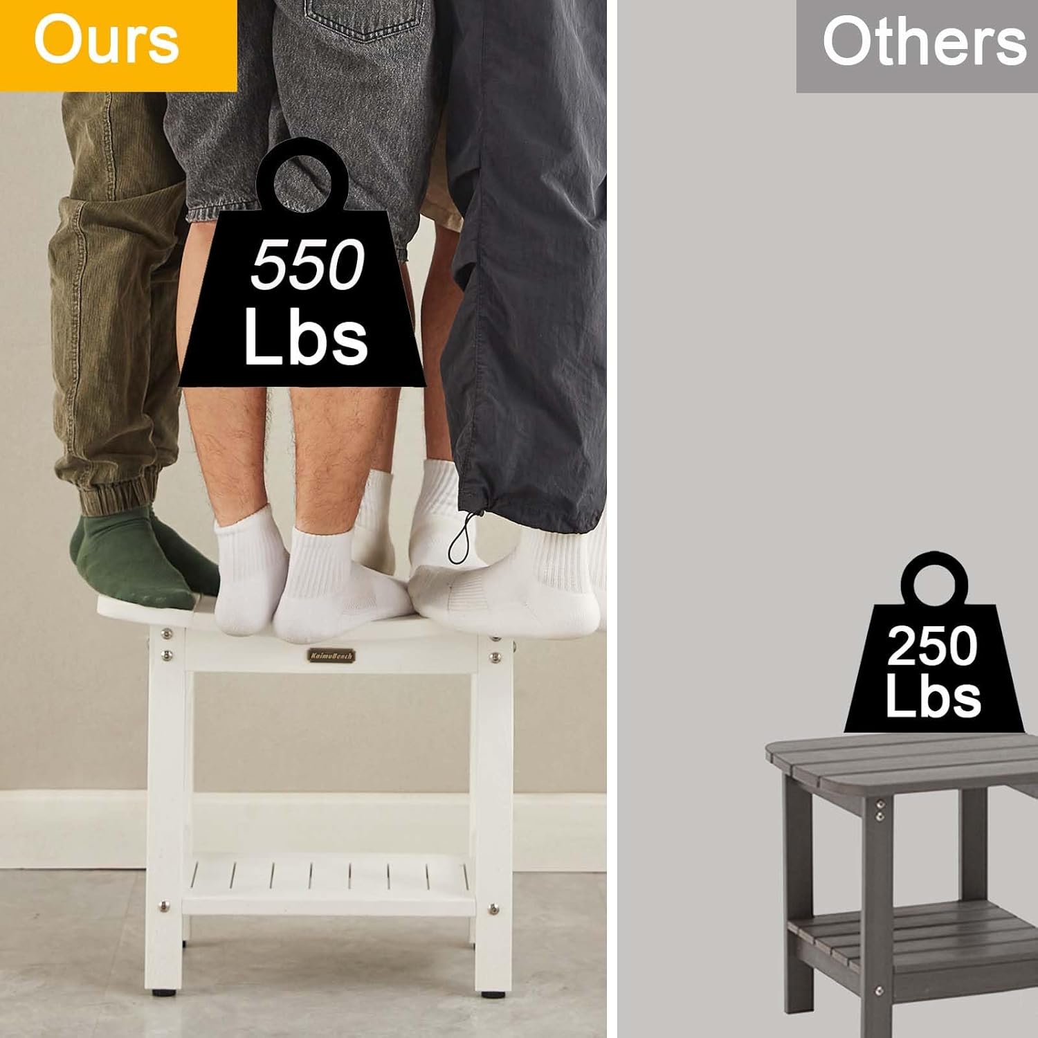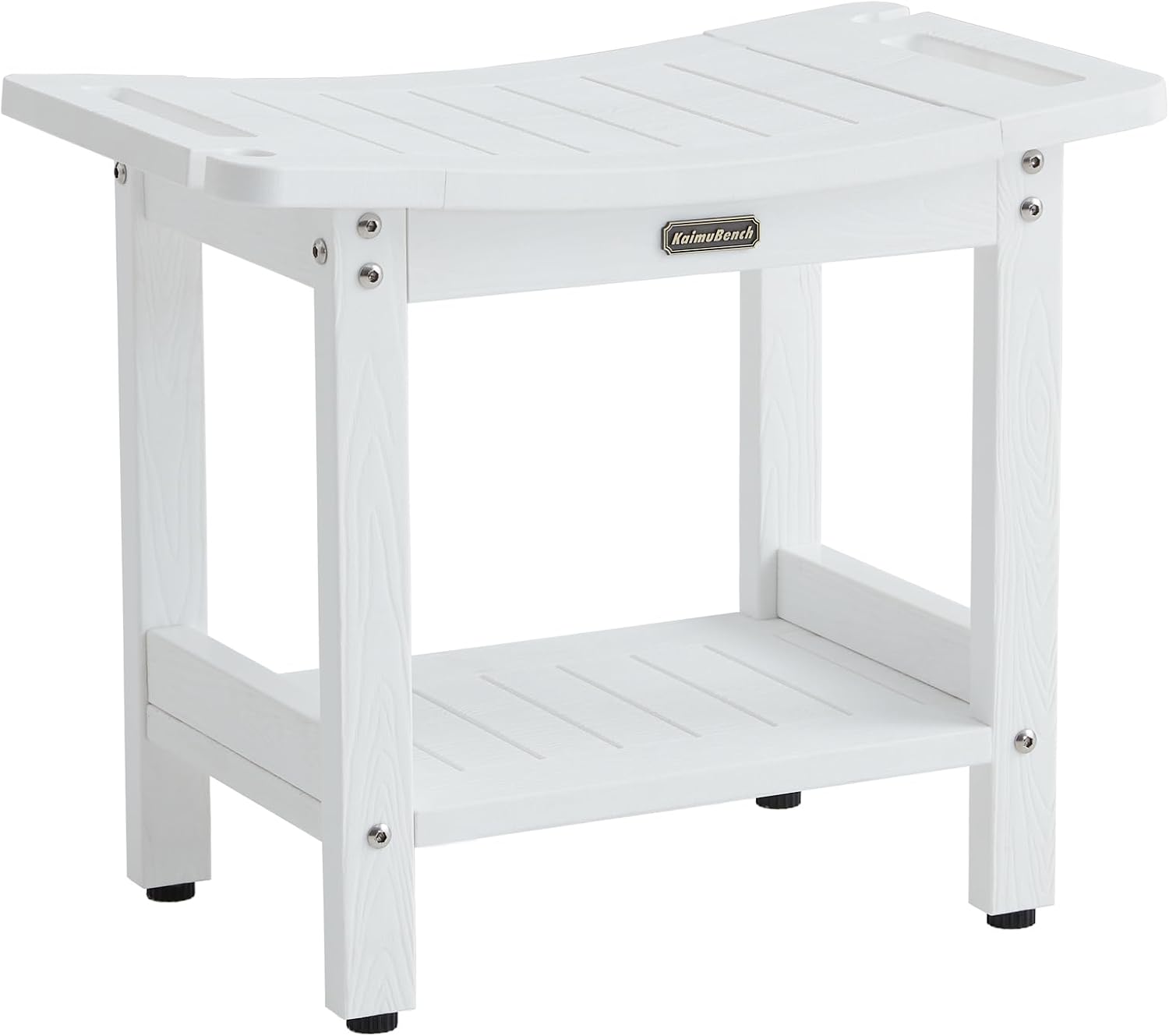 - 【Material & Size】Our poly shower bench is made of HDPS (polystyrene) with 304 stainless screws which never gets rust, rotting or crack after prolonged exposure to humidity, no splinters and no maintenance, 21 x 12.6 x 17.5 Inches enough large to sit (THE MOST IMPORTANT IS NO MAINTENANCE)